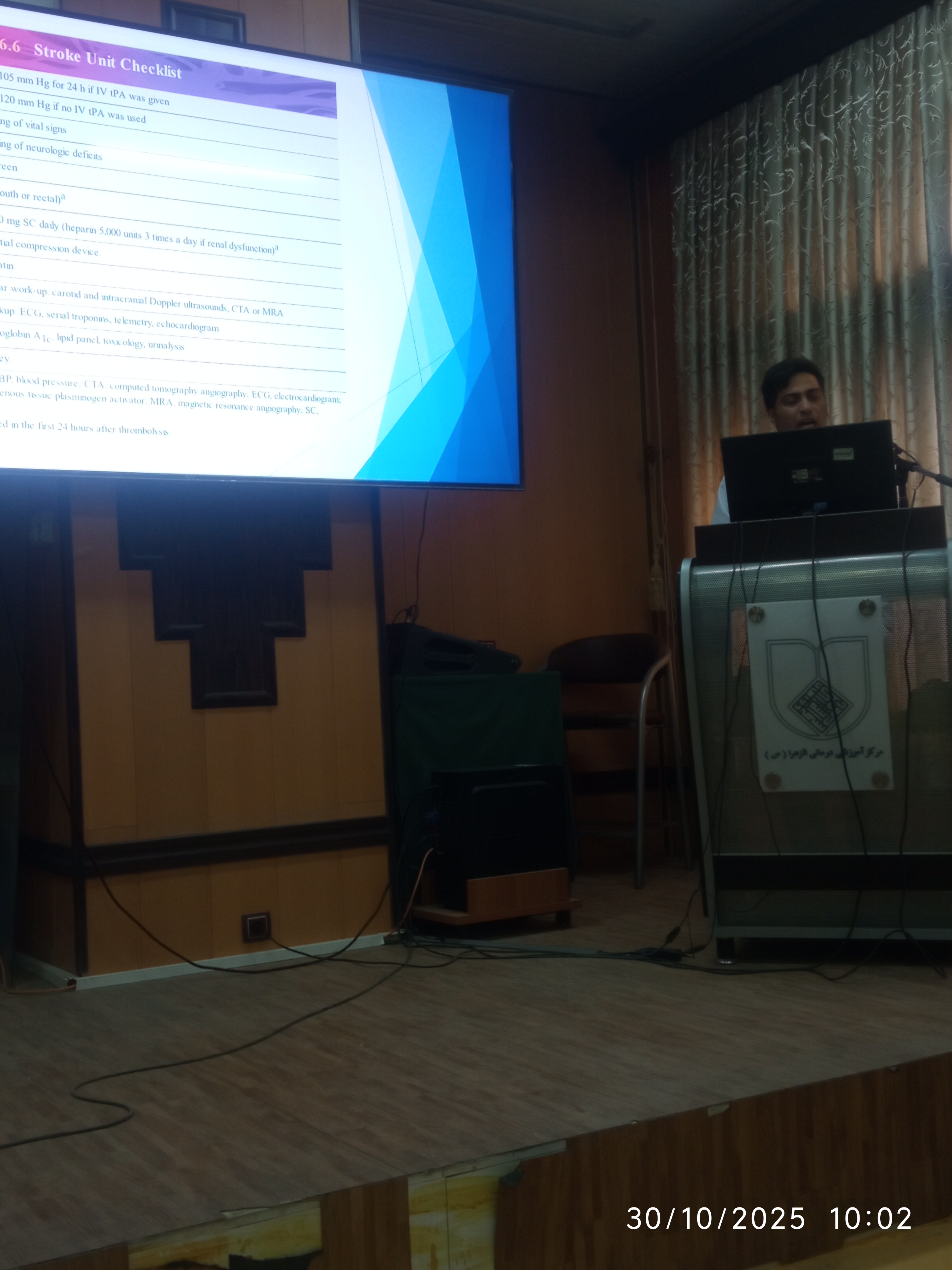 به منظور ارتقای سطح دانش و آگاهی پرستاران استان در خصوص درمان و مراقبت های نوین در حوزه بیماران سکته حاد مغزی(724)، در تاریخ 8 آبانماه 1404 کنفرانس علمی یک روزه تازه های درمان و مراقبت در سکته حاد مغزی(724) در محل سالن شهید مطهری مرکز آموزشی درمانی الزهرا(س) ، با حضور پرستاران مجری برنامه در استان برگزار گردید.