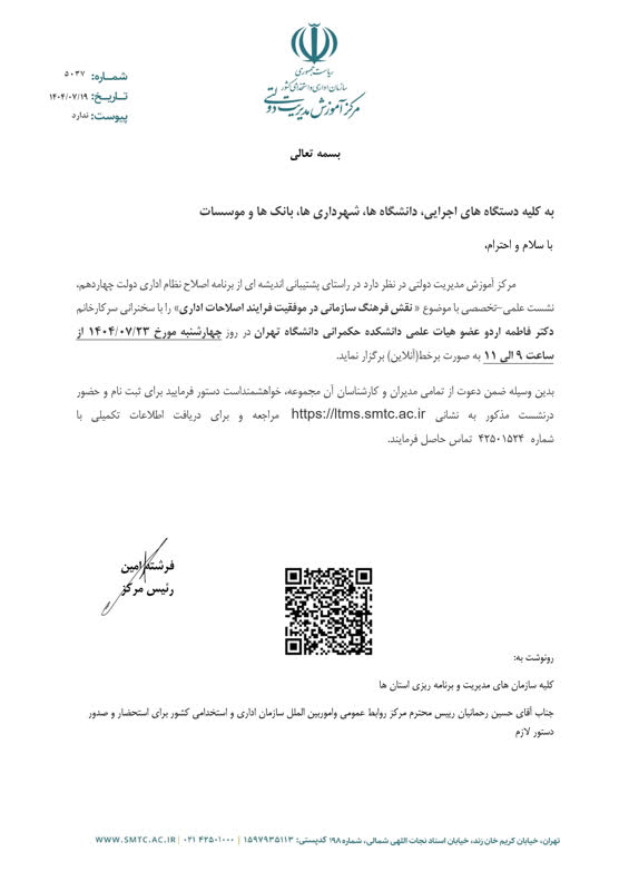 نشست علمی تخصصی فرهنگ سازی دعوت به نشست علمی تخصصی فرهنگ سازی در موقعیت فرایند اصلاحات اداری چهارشنبه 23 مهرماه 1404