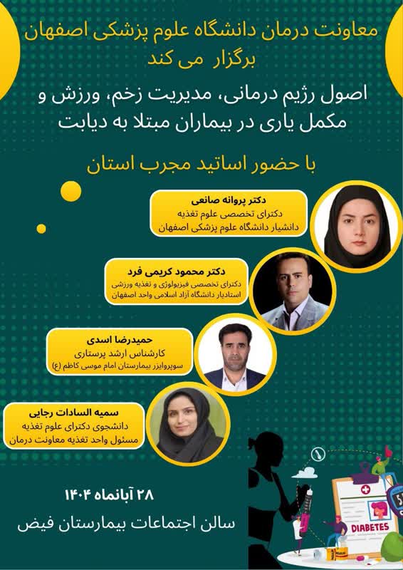 دوره آموزشی اصول رژیم درمانی ، مدیریت زخم ، ورزش و مکمل یاری در بیماران مبتلابه دیابت دوره آموزشی اصول رژیم درمانی ، مدیریت زخم ، ورزش و مکمل یاری در بیماران مبتلابه دیابت