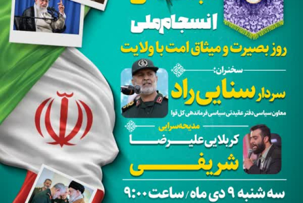 🔰مراسم گرامیداشت یومالله ۹ دی (روز بصیرت و میثاق امت با ولایت) مراسم گرامیداشت یومالله ۹ دی (روز بصیرت و میثاق امت با ولایت) با سخنرانی: سردار رسول سناییراد، معاون سیاسی دفتر عقیدتی سیاسی فرماندهی کل قوا مدیحه سرایی: کربلایی علیرضا شریفی سهشنبه ۹ دی ساعت ۹ صبح میدان انقلاب اصفهان