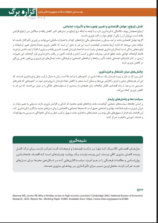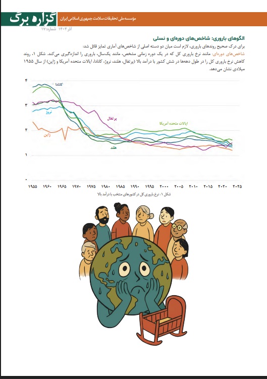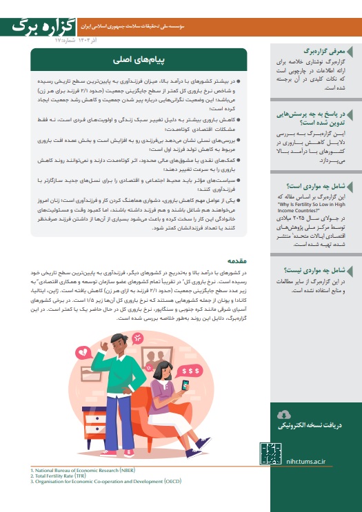 ر بیشتر کشورهای با درآمد بالا، میزان فرزندآوری به پایینترین سطح تاریخی رسیده و شاخص نرخ باروری کل کمتر از سطح جایگزینی جمعیت (حدود 1/2 فرزند برای هر زن) میباشد؛ این وضعیت نگرانیهایی درباره پیر شدن جمعیت و کاهش رشد جمعیت ایجاد کرده است.